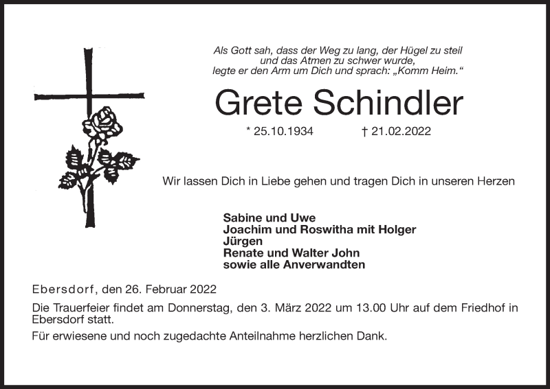 Hier finden Sie alle Traueranzeigen aus der Zeitung, die bisher für Grete Schindler erschienen sind. Weitere Traueranzeigen, die in der Zeitung erscheinen, werden hier ebenfalls aufgelistet