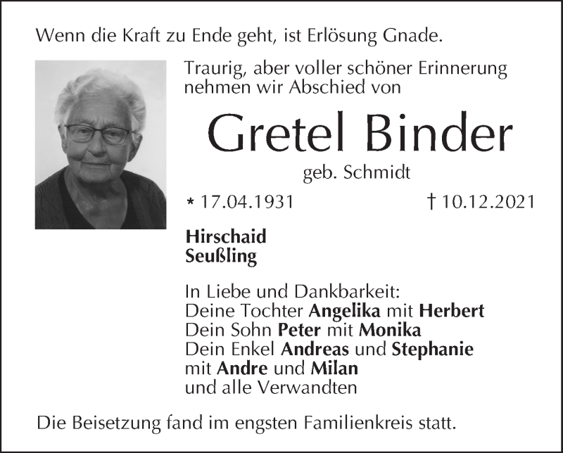 Hier finden Sie alle Traueranzeigen aus der Zeitung, die bisher für Gretel Binder erschienen sind. Weitere Traueranzeigen, die in der Zeitung erscheinen, werden hier ebenfalls aufgelistet