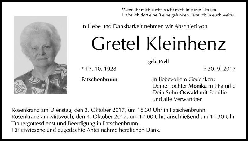 Hier finden Sie alle Traueranzeigen aus der Zeitung, die bisher für Gretel Kleinhenz erschienen sind. Weitere Traueranzeigen, die in der Zeitung erscheinen, werden hier ebenfalls aufgelistet