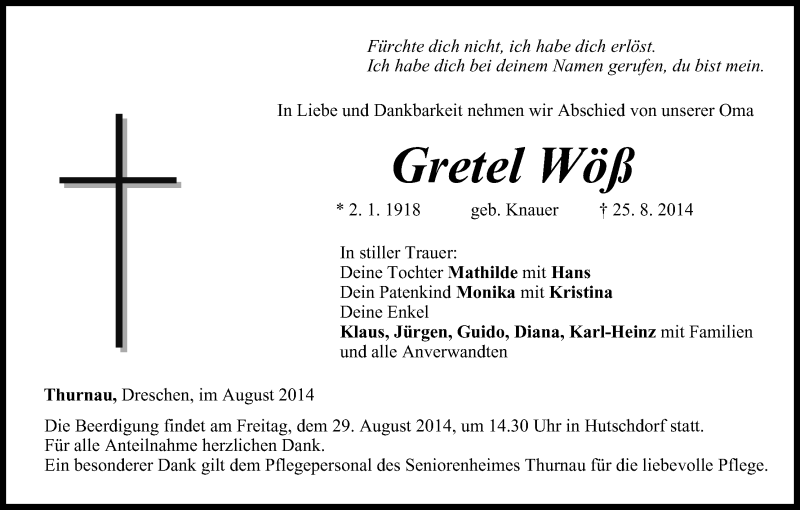 Hier finden Sie alle Traueranzeigen aus der Zeitung, die bisher für Gretel Wöß erschienen sind. Weitere Traueranzeigen, die in der Zeitung erscheinen, werden hier ebenfalls aufgelistet