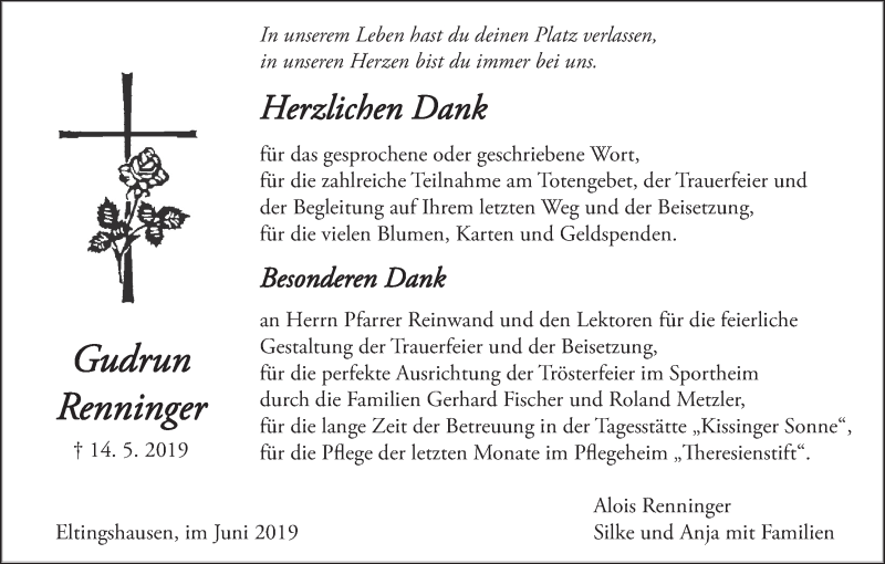 Hier finden Sie alle Traueranzeigen aus der Zeitung, die bisher für Gudrun Renninger erschienen sind. Weitere Traueranzeigen, die in der Zeitung erscheinen, werden hier ebenfalls aufgelistet