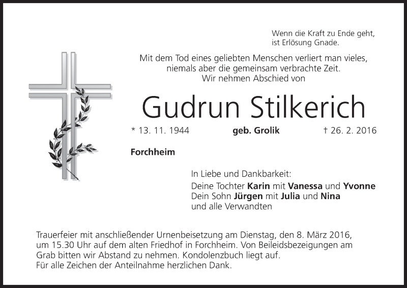 Hier finden Sie alle Traueranzeigen aus der Zeitung, die bisher für Gudrun Stilkerich erschienen sind. Weitere Traueranzeigen, die in der Zeitung erscheinen, werden hier ebenfalls aufgelistet
