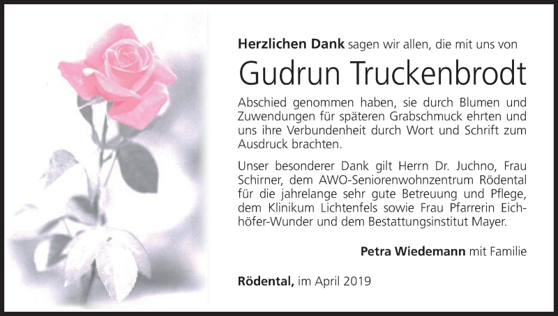 Hier finden Sie alle Traueranzeigen aus der Zeitung, die bisher für Gudrun Truckenbrodt erschienen sind. Weitere Traueranzeigen, die in der Zeitung erscheinen, werden hier ebenfalls aufgelistet