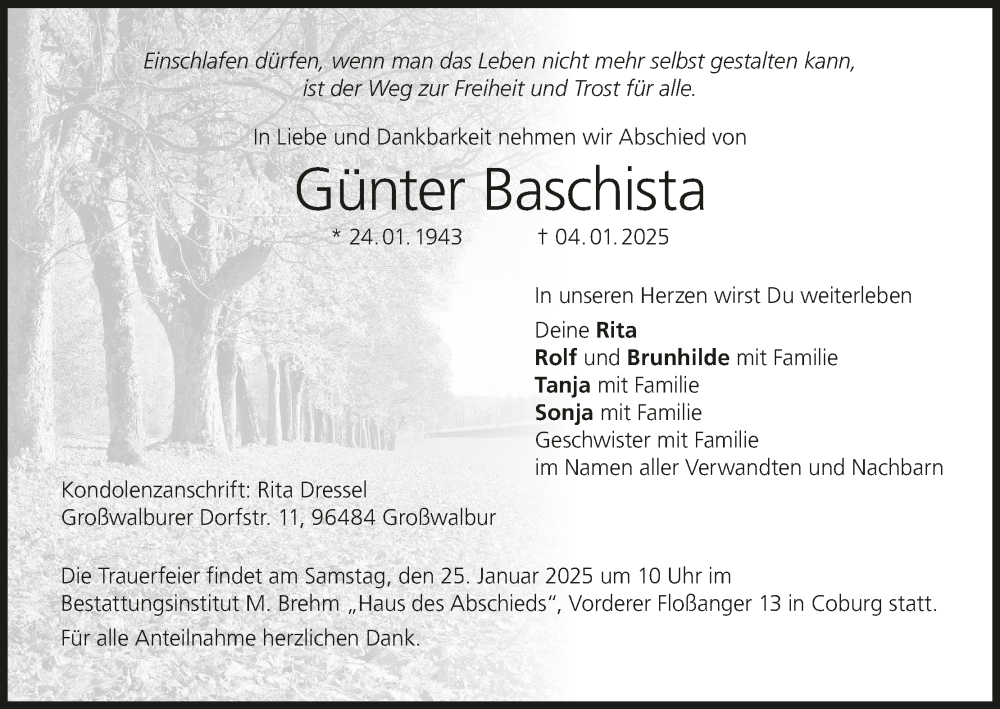 Hier finden Sie alle Traueranzeigen aus der Zeitung, die bisher für Günter Baschista erschienen sind. Weitere Traueranzeigen, die in der Zeitung erscheinen, werden hier ebenfalls aufgelistet