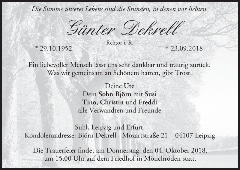 Hier finden Sie alle Traueranzeigen aus der Zeitung, die bisher für Günter Dekrell erschienen sind. Weitere Traueranzeigen, die in der Zeitung erscheinen, werden hier ebenfalls aufgelistet
