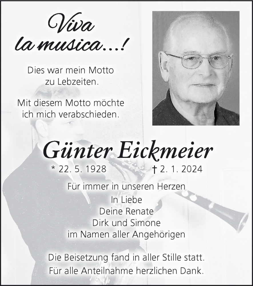 Hier finden Sie alle Traueranzeigen aus der Zeitung, die bisher für Günter Eickmeier erschienen sind. Weitere Traueranzeigen, die in der Zeitung erscheinen, werden hier ebenfalls aufgelistet