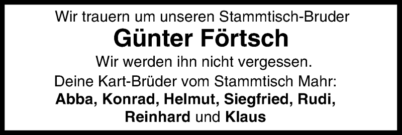 Hier finden Sie alle Traueranzeigen aus der Zeitung, die bisher für Günter Förtsch erschienen sind. Weitere Traueranzeigen, die in der Zeitung erscheinen, werden hier ebenfalls aufgelistet