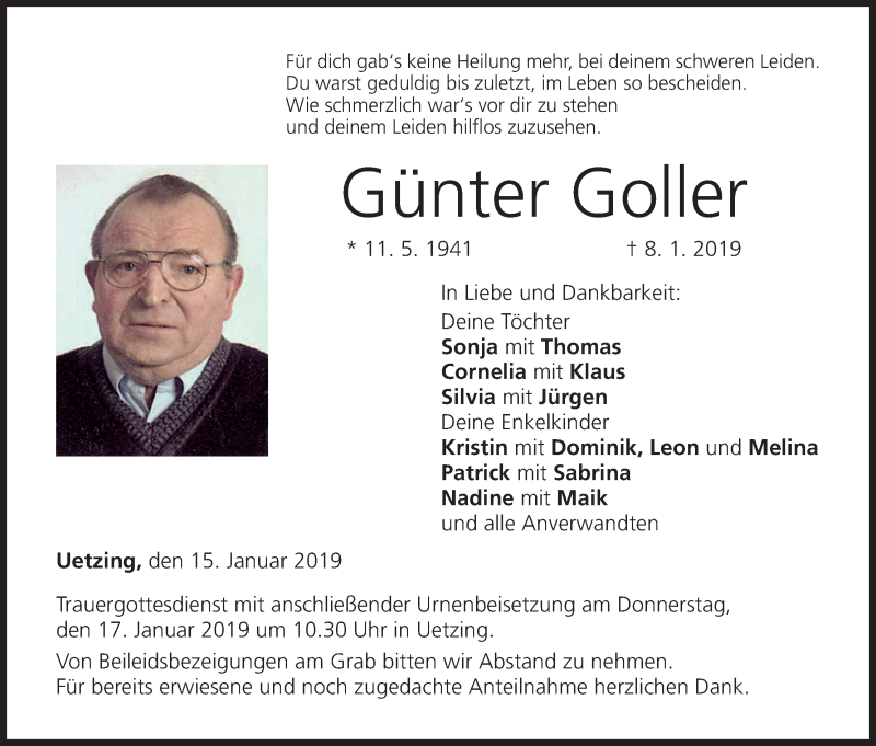 Hier finden Sie alle Traueranzeigen aus der Zeitung, die bisher für Günter Goller erschienen sind. Weitere Traueranzeigen, die in der Zeitung erscheinen, werden hier ebenfalls aufgelistet