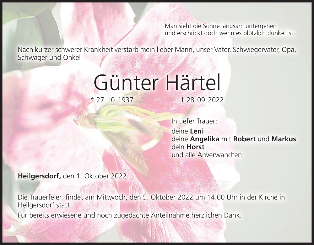 Hier finden Sie alle Traueranzeigen aus der Zeitung, die bisher für Günter Härtel erschienen sind. Weitere Traueranzeigen, die in der Zeitung erscheinen, werden hier ebenfalls aufgelistet