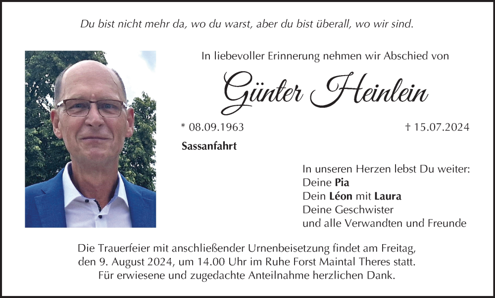 Hier finden Sie alle Traueranzeigen aus der Zeitung, die bisher für Günter Heinlein erschienen sind. Weitere Traueranzeigen, die in der Zeitung erscheinen, werden hier ebenfalls aufgelistet