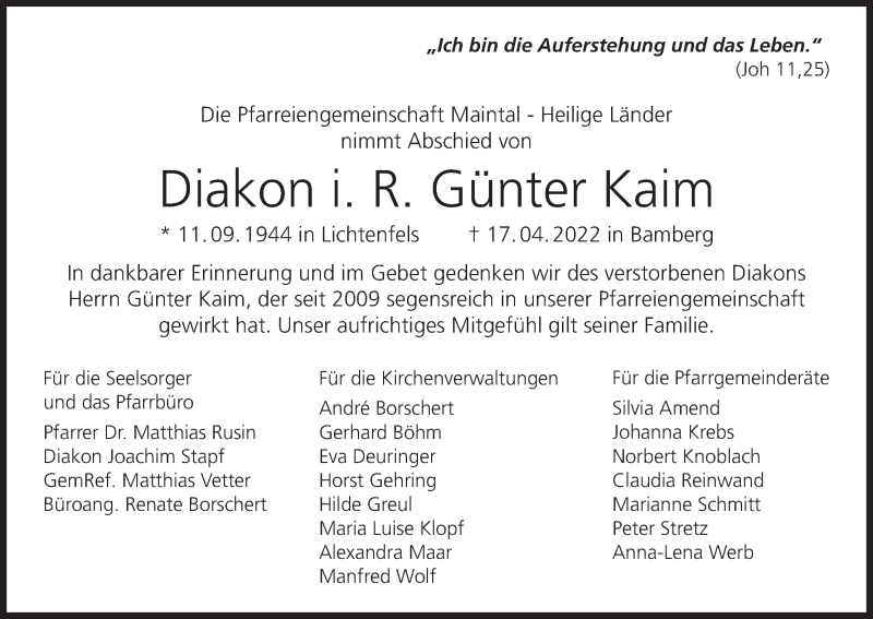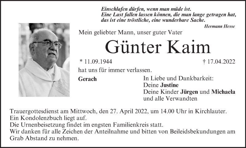 Hier finden Sie alle Traueranzeigen aus der Zeitung, die bisher für Günter Kaim erschienen sind. Weitere Traueranzeigen, die in der Zeitung erscheinen, werden hier ebenfalls aufgelistet