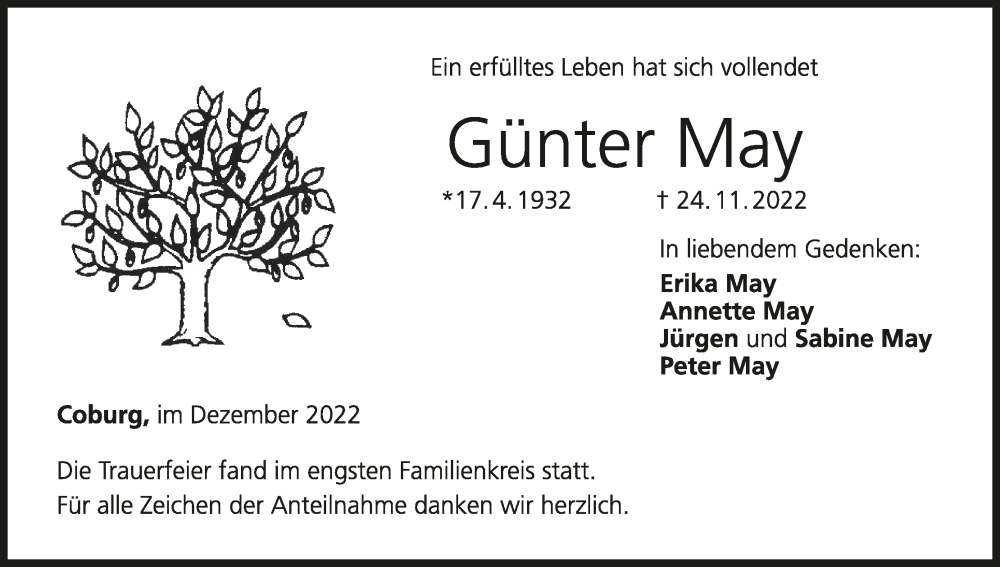Hier finden Sie alle Traueranzeigen aus der Zeitung, die bisher für Günter May erschienen sind. Weitere Traueranzeigen, die in der Zeitung erscheinen, werden hier ebenfalls aufgelistet