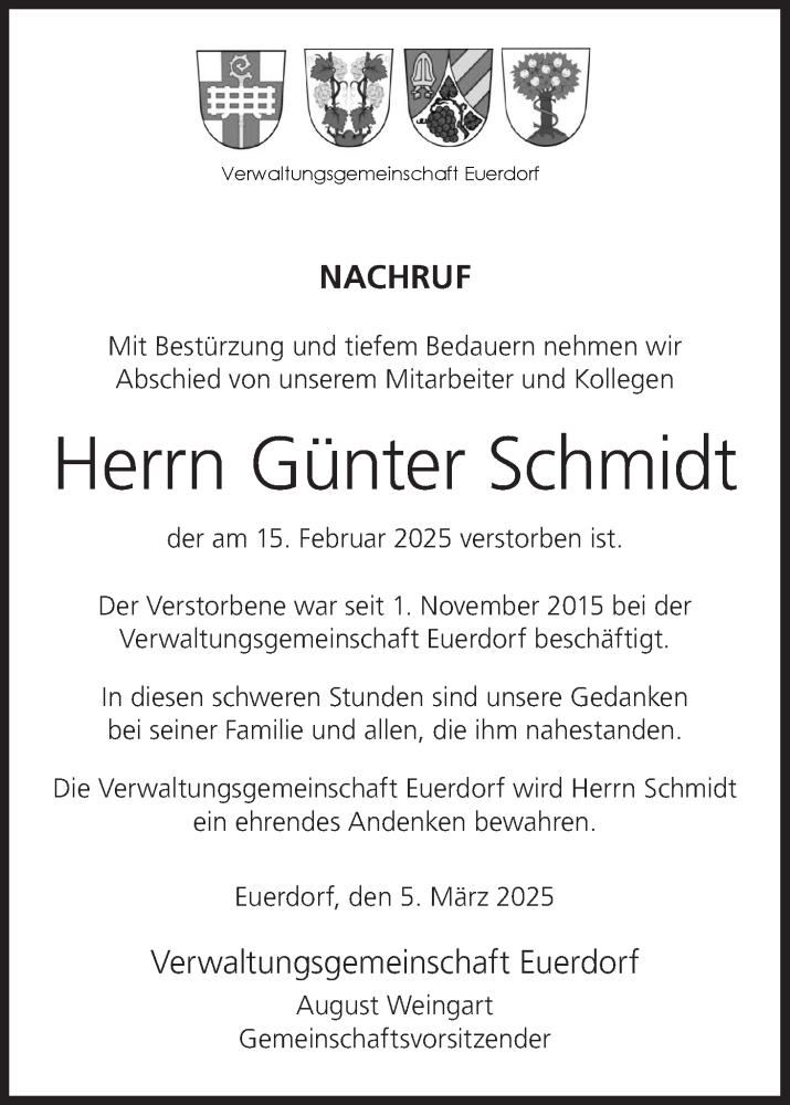 Hier finden Sie alle Traueranzeigen aus der Zeitung, die bisher für Günter Schmidt erschienen sind. Weitere Traueranzeigen, die in der Zeitung erscheinen, werden hier ebenfalls aufgelistet