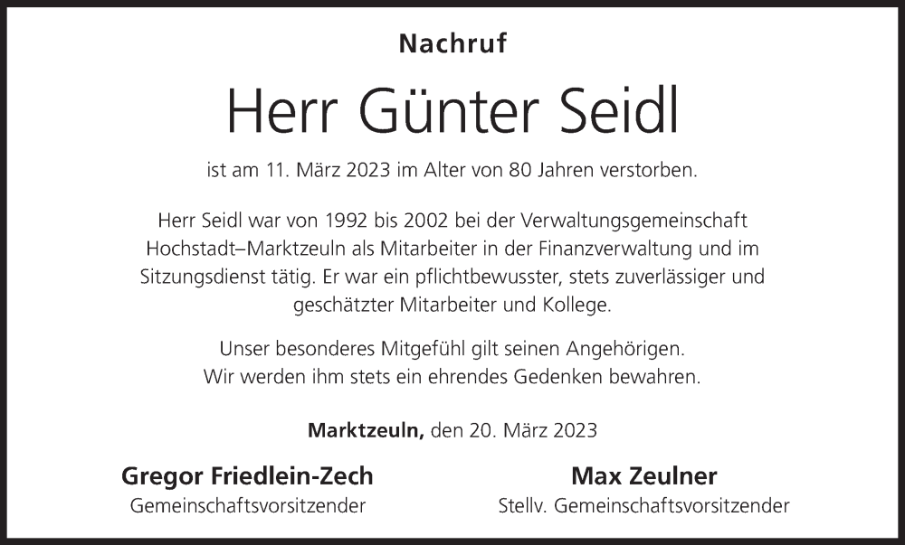 Hier finden Sie alle Traueranzeigen aus der Zeitung, die bisher für Günter Seidl erschienen sind. Weitere Traueranzeigen, die in der Zeitung erscheinen, werden hier ebenfalls aufgelistet