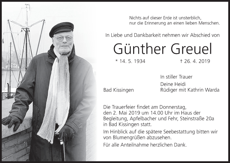 Hier finden Sie alle Traueranzeigen aus der Zeitung, die bisher für Günther Greuel erschienen sind. Weitere Traueranzeigen, die in der Zeitung erscheinen, werden hier ebenfalls aufgelistet