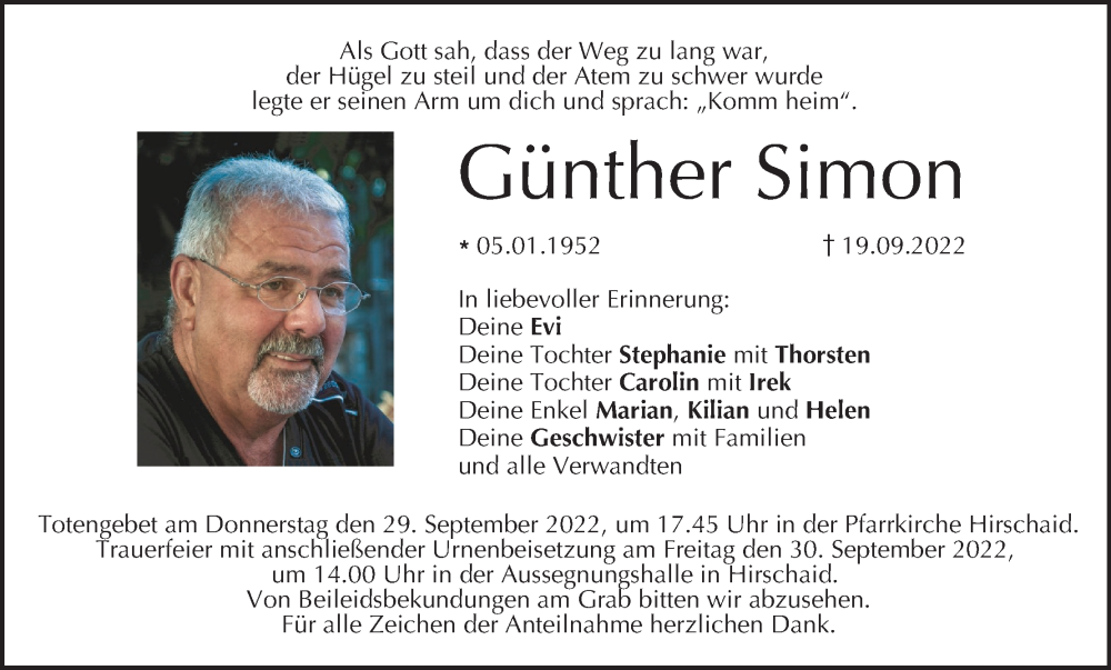 Hier finden Sie alle Traueranzeigen aus der Zeitung, die bisher für Günther Simon erschienen sind. Weitere Traueranzeigen, die in der Zeitung erscheinen, werden hier ebenfalls aufgelistet