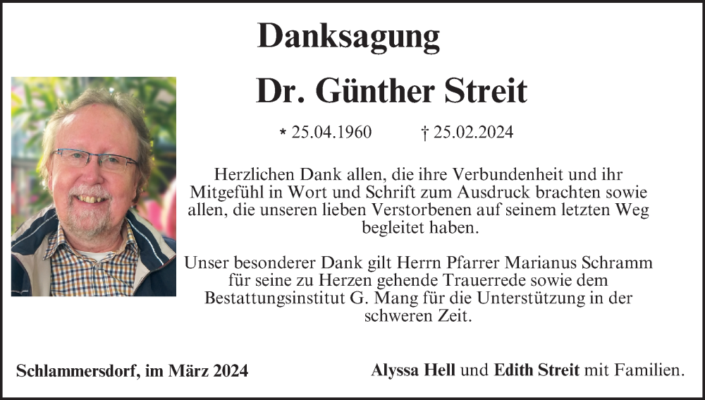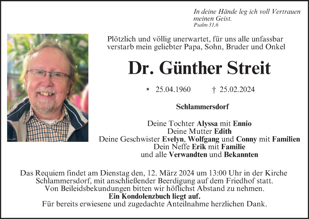 Hier finden Sie alle Traueranzeigen aus der Zeitung, die bisher für Günther Streit erschienen sind. Weitere Traueranzeigen, die in der Zeitung erscheinen, werden hier ebenfalls aufgelistet