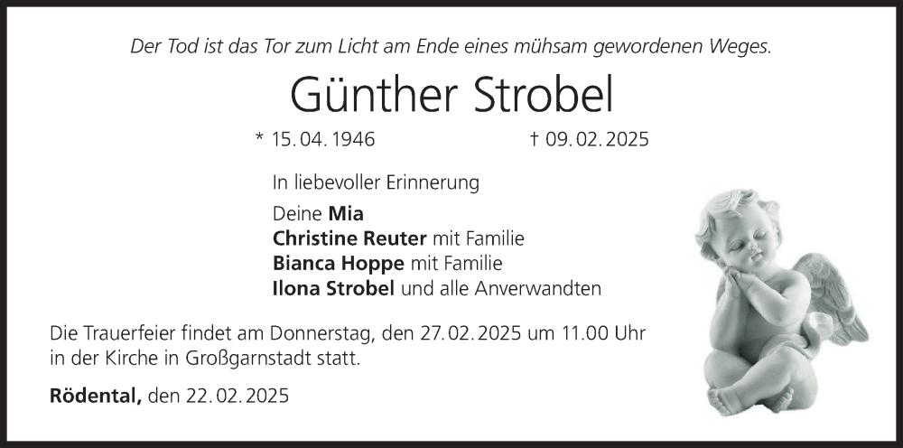 Hier finden Sie alle Traueranzeigen aus der Zeitung, die bisher für Günther Strobel erschienen sind. Weitere Traueranzeigen, die in der Zeitung erscheinen, werden hier ebenfalls aufgelistet