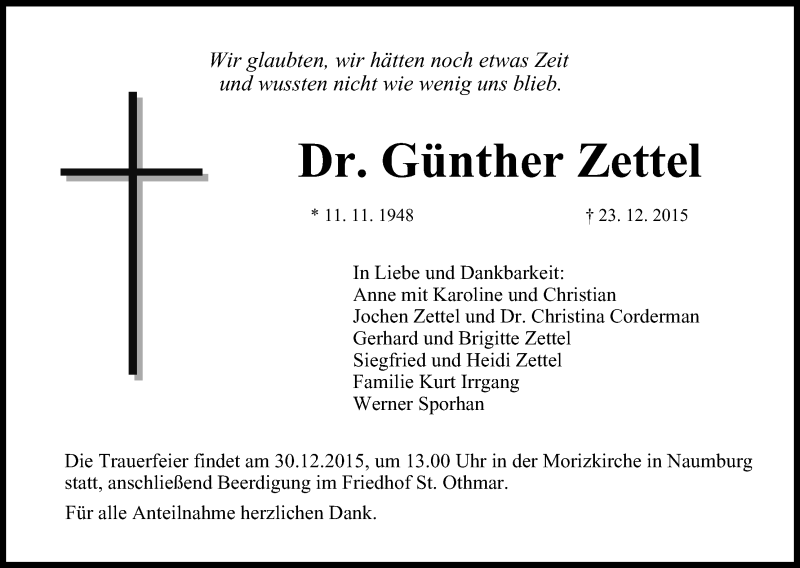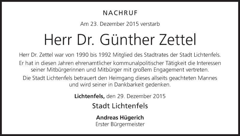 Hier finden Sie alle Traueranzeigen aus der Zeitung, die bisher für Günther Zettel erschienen sind. Weitere Traueranzeigen, die in der Zeitung erscheinen, werden hier ebenfalls aufgelistet