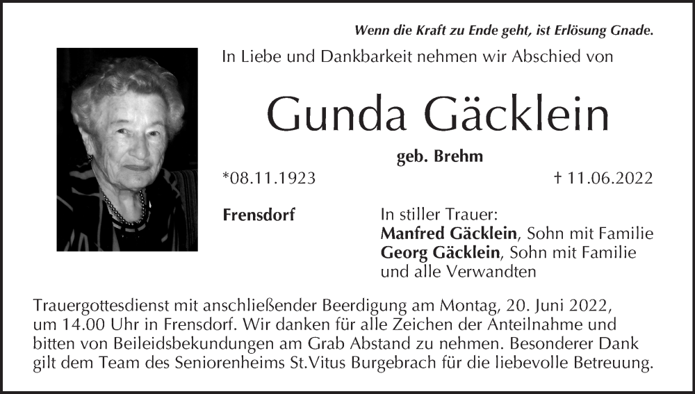 Hier finden Sie alle Traueranzeigen aus der Zeitung, die bisher für Gunda Gäcklein erschienen sind. Weitere Traueranzeigen, die in der Zeitung erscheinen, werden hier ebenfalls aufgelistet