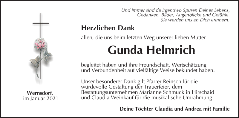 Hier finden Sie alle Traueranzeigen aus der Zeitung, die bisher für Gunda Helmrich erschienen sind. Weitere Traueranzeigen, die in der Zeitung erscheinen, werden hier ebenfalls aufgelistet