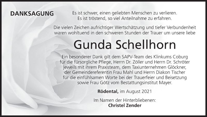 Hier finden Sie alle Traueranzeigen aus der Zeitung, die bisher für Gunda Schellhorn erschienen sind. Weitere Traueranzeigen, die in der Zeitung erscheinen, werden hier ebenfalls aufgelistet
