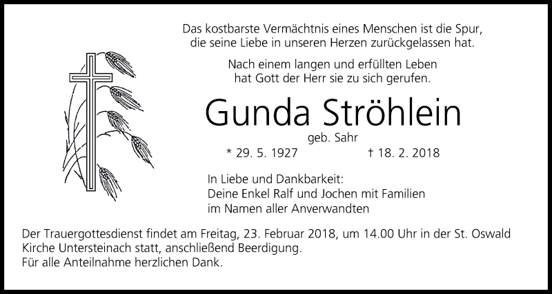 Hier finden Sie alle Traueranzeigen aus der Zeitung, die bisher für Gunda Ströhlein erschienen sind. Weitere Traueranzeigen, die in der Zeitung erscheinen, werden hier ebenfalls aufgelistet
