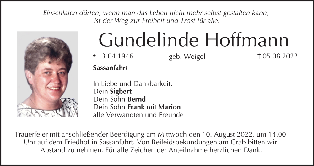 Hier finden Sie alle Traueranzeigen aus der Zeitung, die bisher für Gundelinde Hoffmann erschienen sind. Weitere Traueranzeigen, die in der Zeitung erscheinen, werden hier ebenfalls aufgelistet