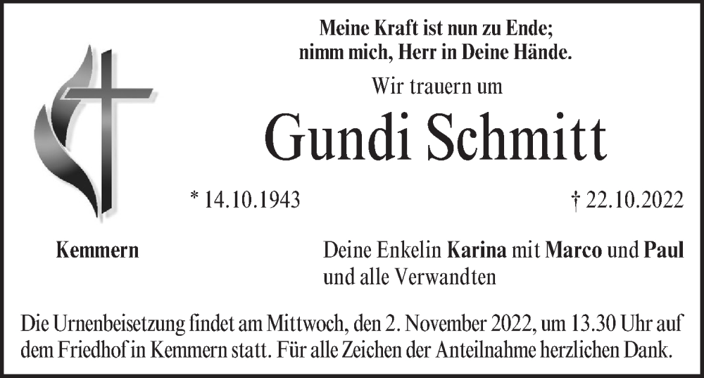 Hier finden Sie alle Traueranzeigen aus der Zeitung, die bisher für Gundi Schmitt erschienen sind. Weitere Traueranzeigen, die in der Zeitung erscheinen, werden hier ebenfalls aufgelistet