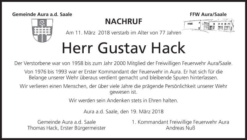 Hier finden Sie alle Traueranzeigen aus der Zeitung, die bisher für Gustav Hack erschienen sind. Weitere Traueranzeigen, die in der Zeitung erscheinen, werden hier ebenfalls aufgelistet