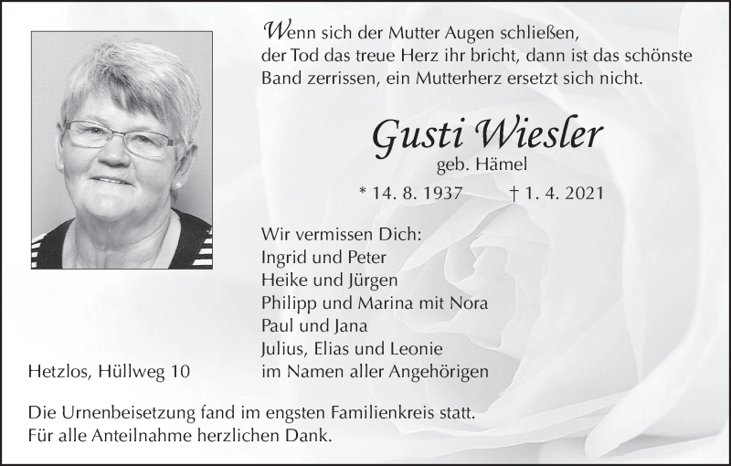 Hier finden Sie alle Traueranzeigen aus der Zeitung, die bisher für Gusti Wiesler erschienen sind. Weitere Traueranzeigen, die in der Zeitung erscheinen, werden hier ebenfalls aufgelistet