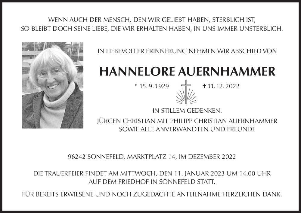 Hier finden Sie alle Traueranzeigen aus der Zeitung, die bisher für Hannelore Auernmann erschienen sind. Weitere Traueranzeigen, die in der Zeitung erscheinen, werden hier ebenfalls aufgelistet
