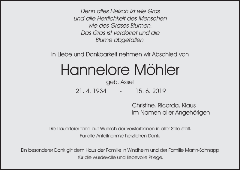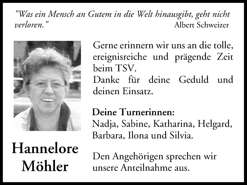 Hier finden Sie alle Traueranzeigen aus der Zeitung, die bisher für Hannelore Möhler erschienen sind. Weitere Traueranzeigen, die in der Zeitung erscheinen, werden hier ebenfalls aufgelistet