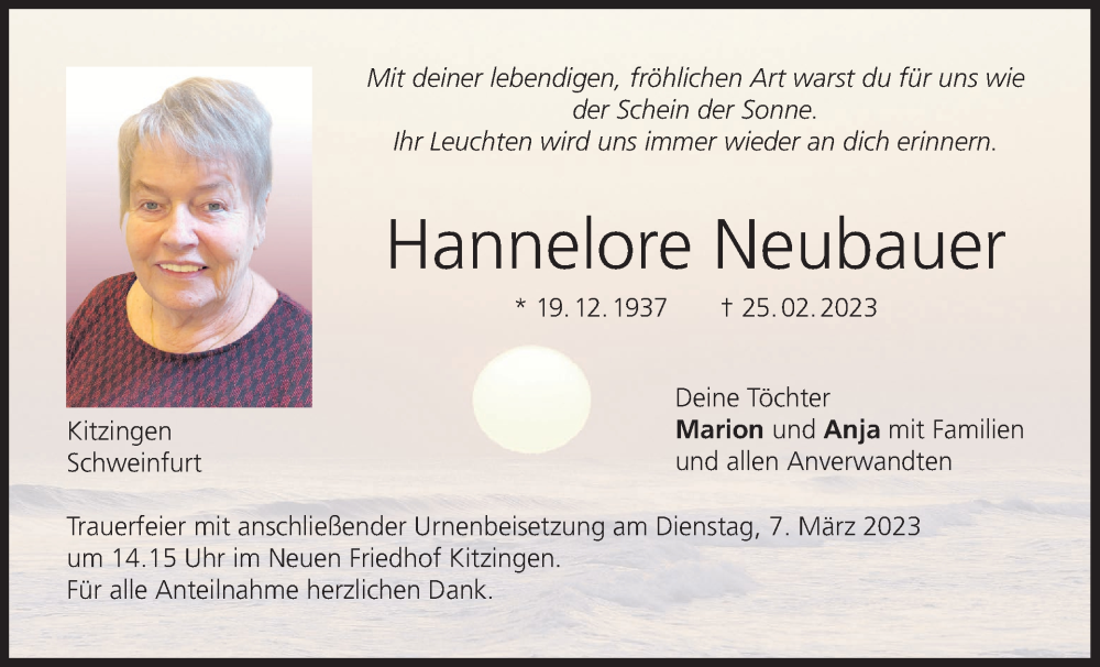 Hier finden Sie alle Traueranzeigen aus der Zeitung, die bisher für Hannelore Neubauer erschienen sind. Weitere Traueranzeigen, die in der Zeitung erscheinen, werden hier ebenfalls aufgelistet
