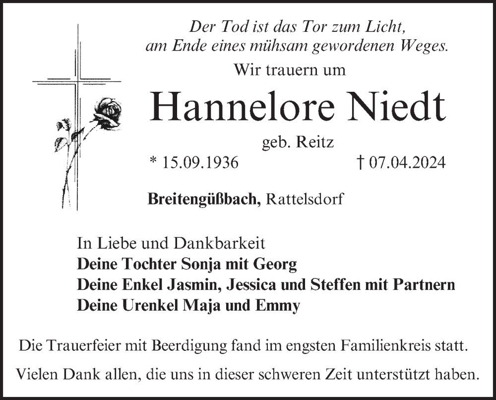 Hier finden Sie alle Traueranzeigen aus der Zeitung, die bisher für Hannelore Niedt erschienen sind. Weitere Traueranzeigen, die in der Zeitung erscheinen, werden hier ebenfalls aufgelistet