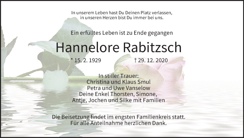 Hier finden Sie alle Traueranzeigen aus der Zeitung, die bisher für Hannelore Rabitzsch erschienen sind. Weitere Traueranzeigen, die in der Zeitung erscheinen, werden hier ebenfalls aufgelistet