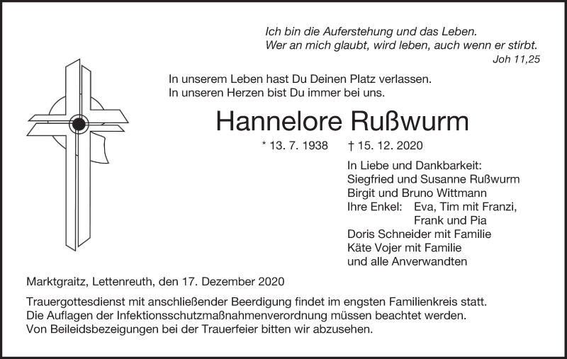 Hier finden Sie alle Traueranzeigen aus der Zeitung, die bisher für Hannelore Rußwurm erschienen sind. Weitere Traueranzeigen, die in der Zeitung erscheinen, werden hier ebenfalls aufgelistet