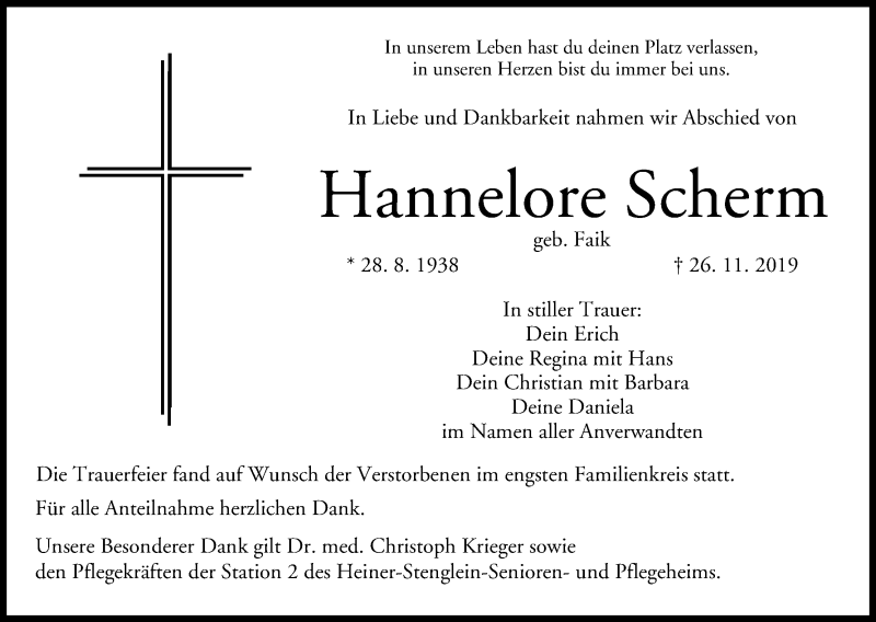Hier finden Sie alle Traueranzeigen aus der Zeitung, die bisher für Hannelore Scherm erschienen sind. Weitere Traueranzeigen, die in der Zeitung erscheinen, werden hier ebenfalls aufgelistet