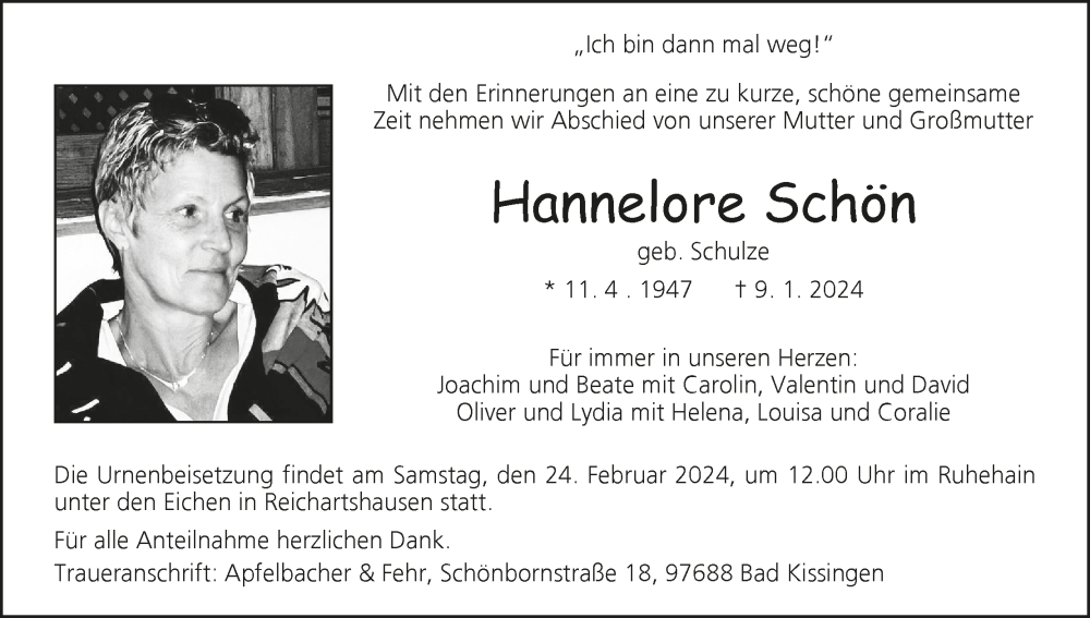 Hier finden Sie alle Traueranzeigen aus der Zeitung, die bisher für Hannelore Schön erschienen sind. Weitere Traueranzeigen, die in der Zeitung erscheinen, werden hier ebenfalls aufgelistet