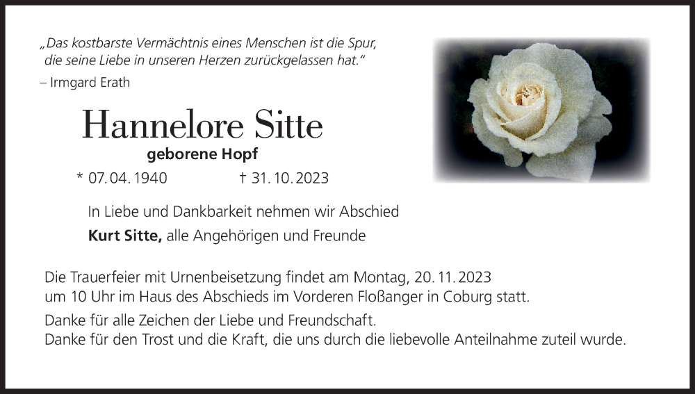 Hier finden Sie alle Traueranzeigen aus der Zeitung, die bisher für Hannelore Sitte erschienen sind. Weitere Traueranzeigen, die in der Zeitung erscheinen, werden hier ebenfalls aufgelistet