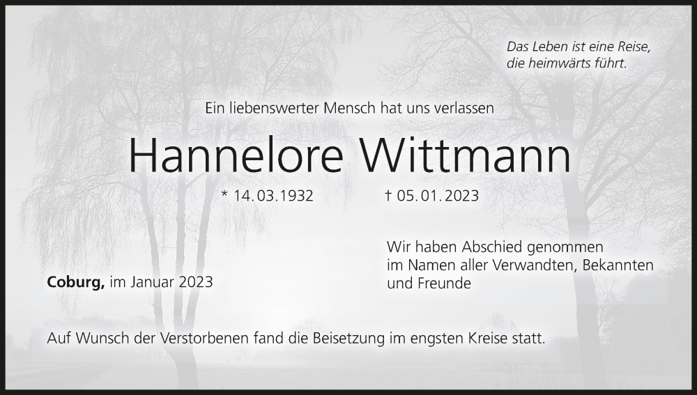 Hier finden Sie alle Traueranzeigen aus der Zeitung, die bisher für Hannelore Wittmann erschienen sind. Weitere Traueranzeigen, die in der Zeitung erscheinen, werden hier ebenfalls aufgelistet