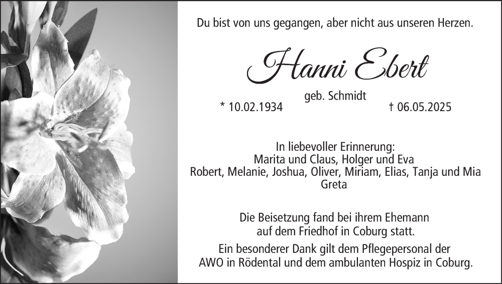 Hier finden Sie alle Traueranzeigen aus der Zeitung, die bisher für Hanni Ebert erschienen sind. Weitere Traueranzeigen, die in der Zeitung erscheinen, werden hier ebenfalls aufgelistet