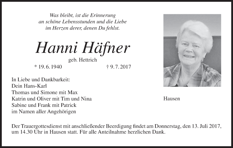 Hier finden Sie alle Traueranzeigen aus der Zeitung, die bisher für Hanni Häfner erschienen sind. Weitere Traueranzeigen, die in der Zeitung erscheinen, werden hier ebenfalls aufgelistet