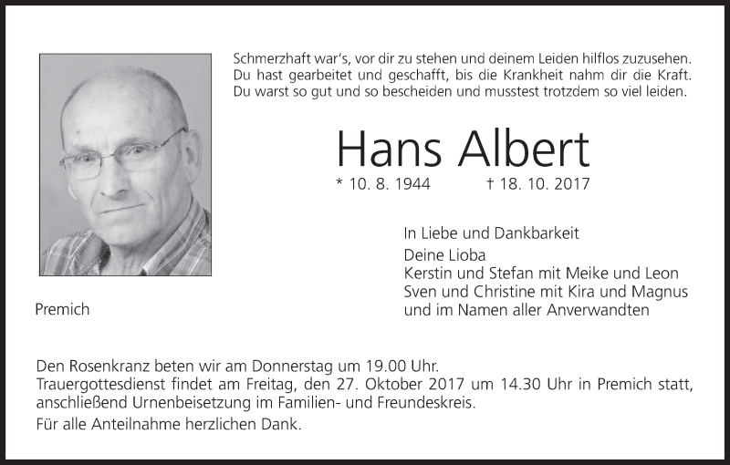 Hier finden Sie alle Traueranzeigen aus der Zeitung, die bisher für Hans Albert erschienen sind. Weitere Traueranzeigen, die in der Zeitung erscheinen, werden hier ebenfalls aufgelistet
