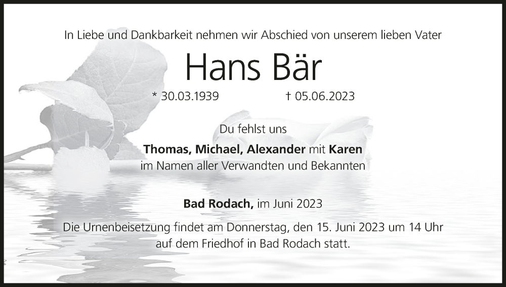 Hier finden Sie alle Traueranzeigen aus der Zeitung, die bisher für Hans Bär erschienen sind. Weitere Traueranzeigen, die in der Zeitung erscheinen, werden hier ebenfalls aufgelistet