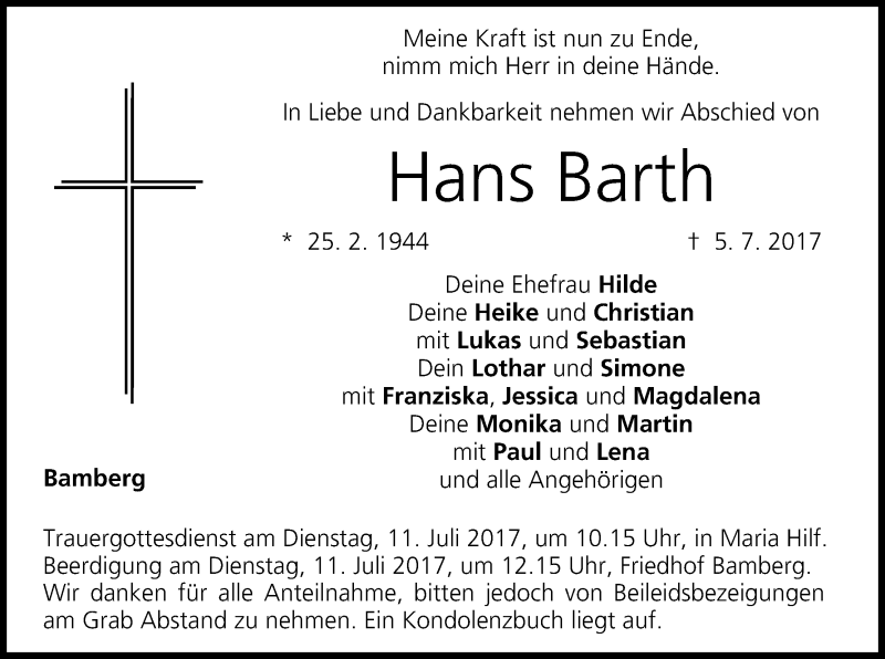 Hier finden Sie alle Traueranzeigen aus der Zeitung, die bisher für Hans Barth erschienen sind. Weitere Traueranzeigen, die in der Zeitung erscheinen, werden hier ebenfalls aufgelistet