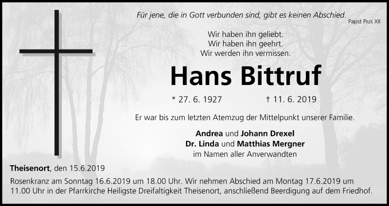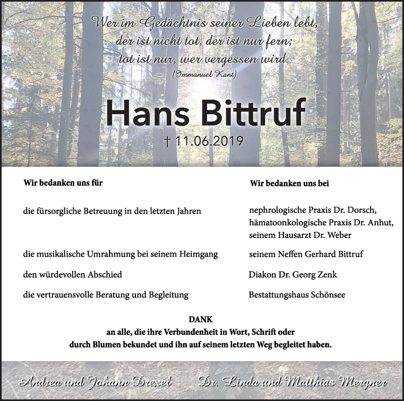 Hier finden Sie alle Traueranzeigen aus der Zeitung, die bisher für Hans Bittruf erschienen sind. Weitere Traueranzeigen, die in der Zeitung erscheinen, werden hier ebenfalls aufgelistet