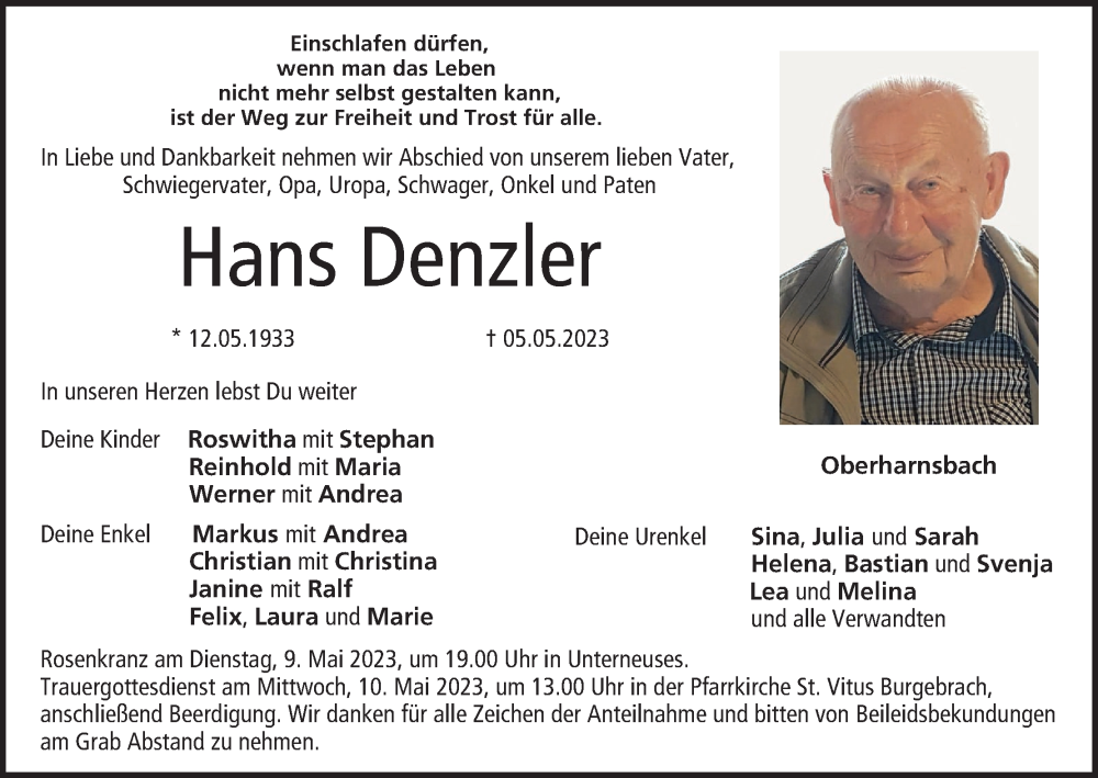 Hier finden Sie alle Traueranzeigen aus der Zeitung, die bisher für Hans Denzler erschienen sind. Weitere Traueranzeigen, die in der Zeitung erscheinen, werden hier ebenfalls aufgelistet