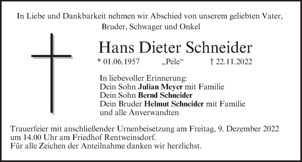 Hier finden Sie alle Traueranzeigen aus der Zeitung, die bisher für Hans Dieter Schneider erschienen sind. Weitere Traueranzeigen, die in der Zeitung erscheinen, werden hier ebenfalls aufgelistet