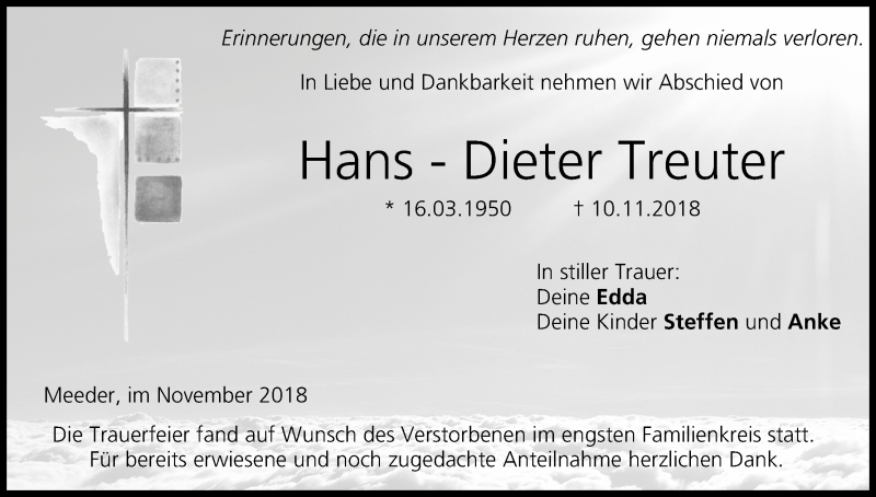 Hier finden Sie alle Traueranzeigen aus der Zeitung, die bisher für Hans-Dieter Treuter erschienen sind. Weitere Traueranzeigen, die in der Zeitung erscheinen, werden hier ebenfalls aufgelistet